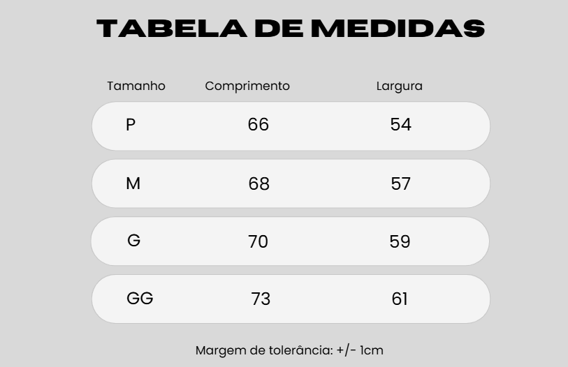 Diversos tamanhos disponíveis para adequar aos mais diferentes shapes. Confira abaixo as medidas das peças: